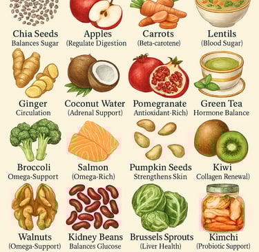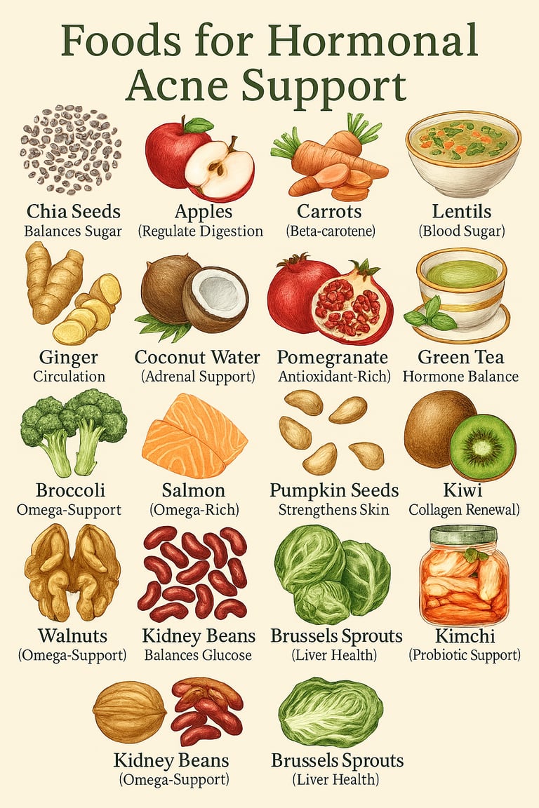 Struggling with hormonal acne? Discover 15 powerful foods—like chia seeds, salmon, and green tea—that balance hormones, regulate blood sugar, and boost skin health naturally.